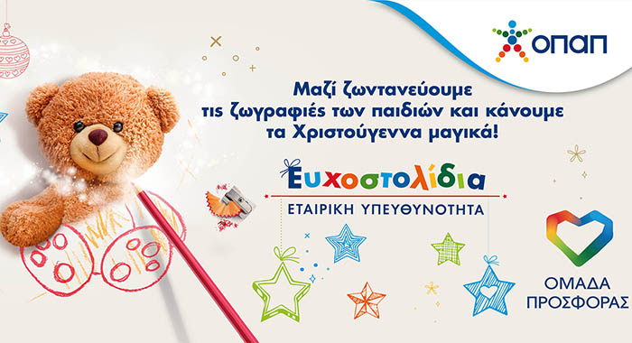 Το πνεύμα των Χριστουγέννων εφέτος έρχεται νωρίτερα μέσα από την πρωτοβουλία Ευχοστολίδια, με στόχο όλοι μαζί να προσφέρουμε σε χιλιάδες παιδιά που έχουν ανάγκη και να εκπληρώσουμε τις ευχές τους έως το τέλος του έτους. Ο ΟΠΑΠ, στο πλαίσιο της μεγάλης γιορτής προσφοράς και αγάπης που πραγματοποιεί για έκτη συνεχή χρονιά, μας καλεί όλους να επιλέξουμε τα Ευχοστολίδιαγιανα κάνουμε πραγματικότητα τις ζωγραφιές–χριστουγεννιάτικες ευχές των παιδιών από τον Οργανισμό «Το Χαμόγελο του Παιδιού», την Ένωση «Μαζί για το Παιδί», τα Παιδικά Χωριά SOS και το Ίδρυμα Γεωργίου και Αικατερίνης Χατζηκώνστα.