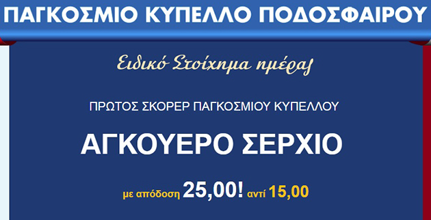 Το ΠΑΜΕ ΣΤΟΙΧΗΜΑ του ΟΠΑΠ προσφέρει σήμερα ειδικό στοίχημα για τον Σέρχιο Αγκουέρο, ως πρώτο σκόρερ του Παγκοσμίου Κυπέλλου, με ιδιαίτερα ανταγωνιστική απόδοση. Για 24 ώρες, μέχρι το επόμενο δηλαδή ειδικό στοίχημα, οι παίκτες του ΠΑΜΕ ΣΤΟΙΧΗΜΑ μπορούν να διεκδικήσουν ακόμη μεγαλύτερα κέρδη, ποντάροντας στον Αγκουέρο.