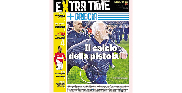 «Το ποδόσφαιρο του πιστολιού». Συγκεκριμένα, οι Ιταλοί σημειώνουν: «Ταξιδεύουμε στην Αθήνα, όπου πρόεδροι ομάδων μπαίνουν οπλισμένοι στο γήπεδο. Παράλληλα, βρίσκονται υπό έρευνα για διακίνηση ναρκωτικών, διαφθορά και στημένα ματς. Εκεί που το πρωτάθλημα τα τελευταία τέσσερα χρόνια έχει διακοπεί τέσσερις φορές λόγω της βίας. Και δεν υπολογίζουμε τα παιχνίδια που έχουν κριθεί στα χαρτιά. Η ελληνική κυβέρνηση είναι ανάμεσα σε FIFA και UEFA και για το θέμα με τα Σκόπια και την ονομασία τους και κανένας δεν ξέρει τι… ψάρια θα πιάσει».