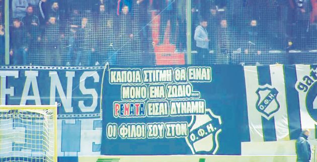 Μπράβο στους οργανωμένους του ΟΦΗ για την ενέργειά τους το Σάββατο το βράδυ. Αυτό το ποδόσφαιρο θέλουμε, αυτό το ποδόσφαιρο θα φέρει τον κόσμο στα γήπεδα. Δείγμα οπαδικού πολιτισμού, που δεν είναι ό,τι πιο συνηθισμένο στα ελληνικά γήπεδα, αυτό που έκανε την εμφάνισή του προχθές στο «Γεντί Κουλέ», στην αναμέτρηση του ΟΦΗ με τον Πανιώνιο. Οι Ομιλίτες έστειλαν μήνυμα συμπαράστασης σε μια φίλη του Πανιωνίου η οποία δίνει τη δική της μεγάλη μάχη με τον καρκίνο. «Κάποια στιγμή θα είναι μόνο ένα ζώδιο… Ρενάτα είσαι δύναμη. Οι φίλοι σου στον ΟΦΗ», ήταν το μήνυμα του πανό που ανέβασαν στην κερκίδα τους.