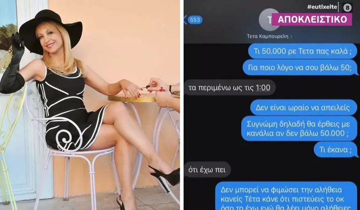Ωστόσο γρήγορα διαπίστωσε εμβρόντητος ότι η σύζυγος του 58χρονου Βασίλη Γκουρούση, ο οποίος έχει προφυλακιστεί για την υπόθεση της μεγάλης αρπαγής από τις θυρίδες κοσμικών κυριών σε τράπεζας του Ψυχικού, εννοούσε αυτά που του έγραφε στα μηνύματά της. Διέκρινε, μάλιστα, όπως ήταν φυσικό, και μια απειλή πίσω από τα γραφόμενά της. Οπως έγινε γνωστό μέσω της εκπομπής «Ευτυχείτε», στο Open, με την Κατερίνα Καινούργιου, η ξανθιά αισθητικός, που έχει δοκιμαστεί και ως ηθοποιός στο θεατρικό σανίδι, φέρεται ότι εκβιάζει τον γνωστό παρουσιαστή και εκδότη του «ΟΚ!» ζητώντας του 50.000 ευρώ με αφορμή τις φωτογραφίες της που φιλοξενούνται στο αυριανό τεύχος του περιοδικού.