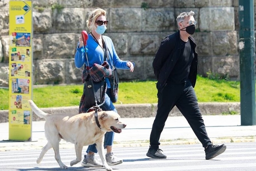 Η Σμαράγδα Καρύδη και ο Θοδωρής Αθερίδης τηρούν τα μέτρα προστασίας κατά του κορονοϊού και βγαίνουν βόλτα με τον σκύλο τους φορώντας μάσκες.