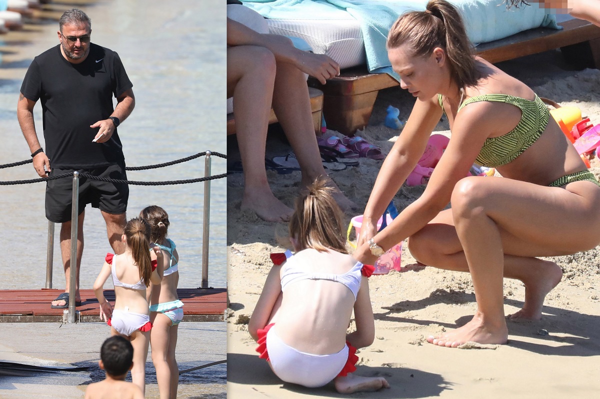Φορώντας μπικίνι μαγιό που τόνιζε το καλλίγραμμο σώμα της έπαιζε στην άμμο με τη μικρή Ελένη ενώ στη συνέχεια εμφανίστηκε και ο τραγουδιστής.