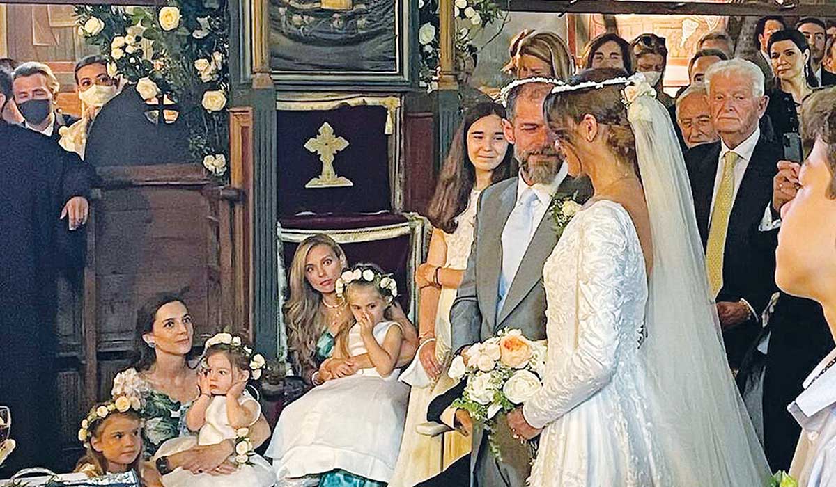 Η ιστορική εκκλησία που δεσπόζει στο κέντρο του χωριού στολίστηκε με εκατοντάδες λευκά τριαντάφυλλα, προσδίδοντας μεγαλοπρέπεια στον γάμο των δύο νέων παιδιών. Η όμορφη νύφη φορούσε κεντημένο νυφικό με την υπογραφή ξένου οίκου υψηλής ραπτικής, με μακρύ πέπλο, και ο γαμπρός μπονζούρ, που επιλέγουν να φορούν στους γάμους τους γαλαζοαίματοι και γόνοι αριστοκρατικών οικογενειών της γηραιάς Αλβιώνας.