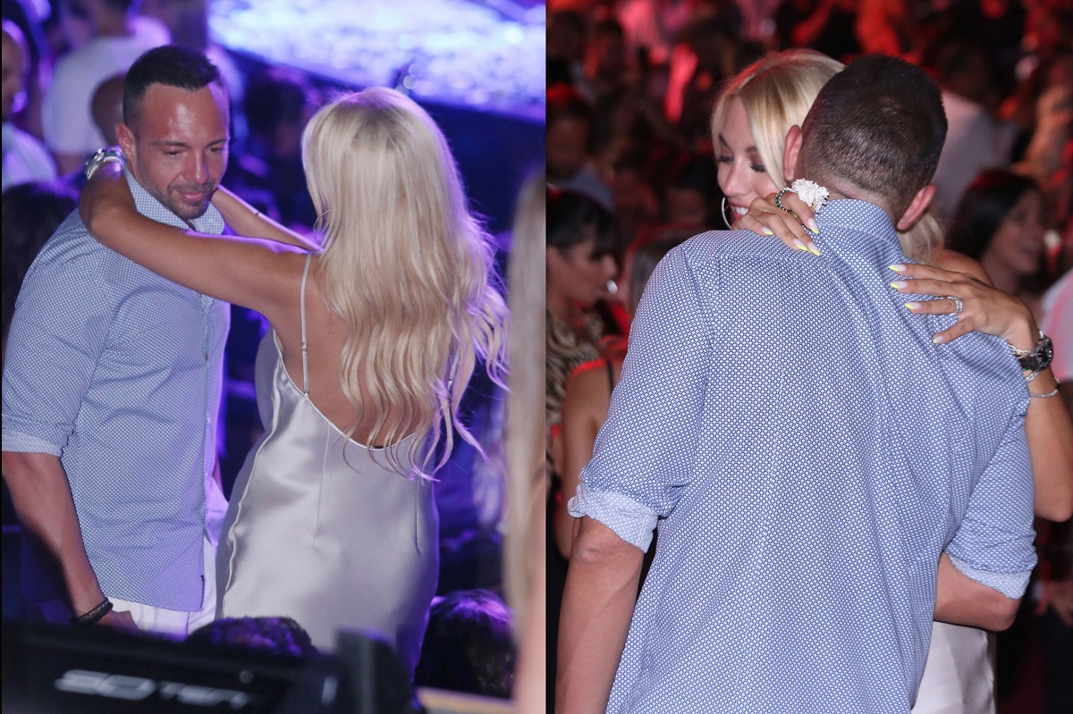 Η Κωνσταντίνα Σπυροπούλου φορώντας σατέν, μίνι φόρεμα που τόνιζε το καλλίγραμμο σώμα της διασκέδασαν με την παρέα του με το ζευγάρι να μη σταματάει τις αγκαλιές.
