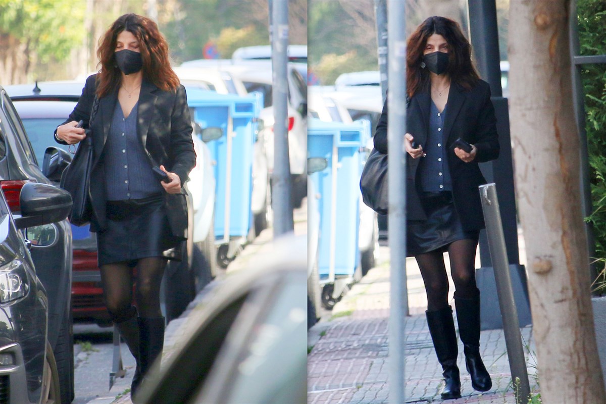 Σε ένα μήνα θα γίνει 55 χρονών και είναι στα καλύτερά της. Κάνει τη δουλειά που της αρέσει, έχει αποκτήσει τρεις κόρες και πρόσφατα έγινε και γιαγιά! Ο φωτογραφικός μας φακός την απαθανάτισε στην περιοχή των Αγίων Αναργύρων φεύγοντας από το ραδιοφωνικό σταθμό Μουσικός 98.6 όπου κάνει εκπομπή. Φορώντας μίνι φούστα, με πουλόβερ και δερμάτινο σακάκι και χωρίς ίχνος μακιγιάζ ήταν μια κούκλα.