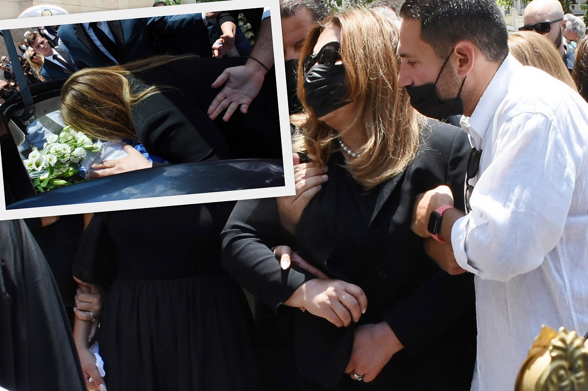 Βγήκε από την εκκλησία υποβασταζόμενη και με λυγμούς έπεσε πάνω στο φέρετρο του συζύγου της και το αγκάλιαζε μη μπορώντας για κάποια λεπτά να την απομακρύνουν.
