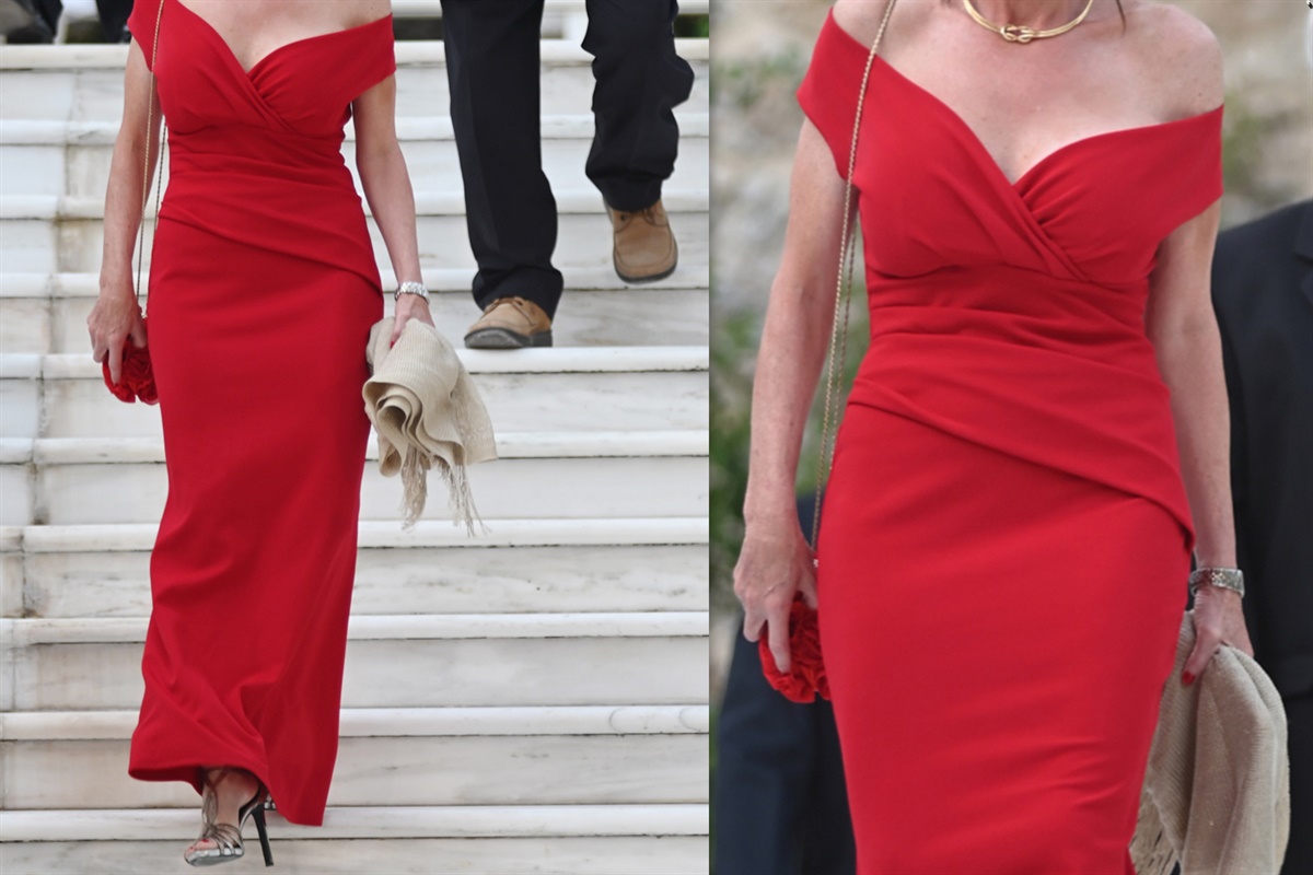 Φορώντας μια κόκκινη τουαλέτα, που τόνιζε το καλλίγραμμο σώμα της, με τα μαλλιά της πιασμένα κότσο, με διακριτικό μακιγιάζ και εντυπωσιακά κοσμήματα εμφανίστηκε τραβώντας πάνω της όλα τα φλας.