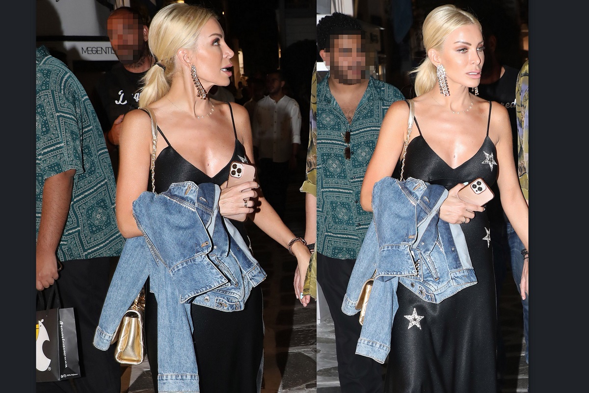 Η «φρεσκοχωρισμένη» παρουσιάστρια είναι ελεύθερη και ωραία και διασκεδάζει στο νησί των Ανέμων. Σε βραδινή έξοδό της με τον καλό της φίλο Χάρη Σιανίδη επέλεξε ένα μακρύ μαύρο φόρεμα με μια τσάντα σε χρυσό μεταλλικό χρώμα.