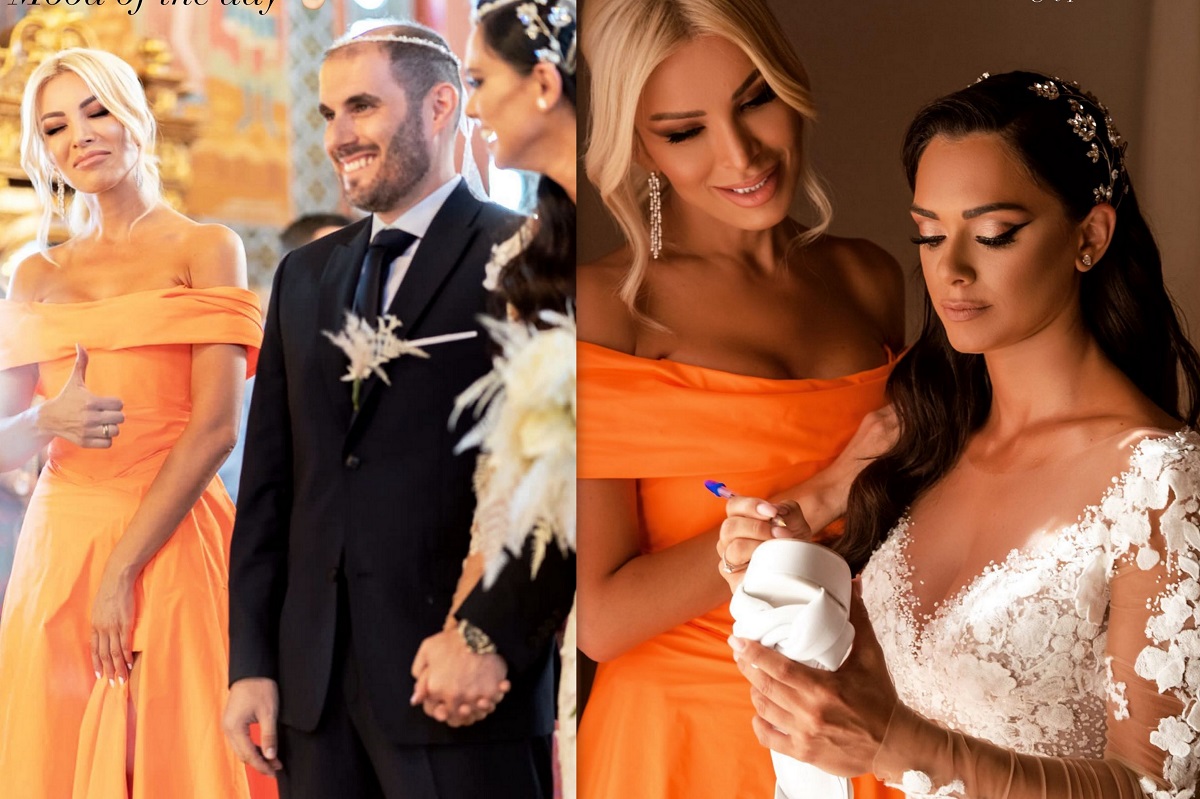 wedding party που διοργανώθηκε στη Λάσση. Η Κατερίνα Καινούργιου επέλεξε να φορέσει το Σάββατο στο μυστήριο μια εντυπωσιακή τουαλέτα σε πορτοκαλί απόχρωση και έκλεψε τις εντυπώσεις.