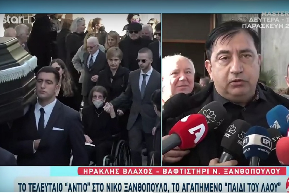 Ο γιος του Ανέστη Βλάχου, Ηρακλής πήγε στο Ά Νεκροταφείο να αποχαιρετήσει το νονό του, Νίκο Ξανθόπουλο και είπε δυο λόγια στους δημοσιογράφους.