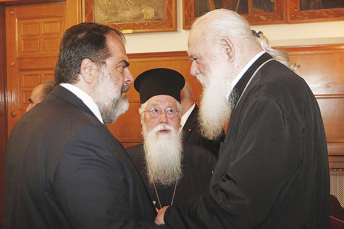 Ο εφοπλιστής Νικόλας Πατέρας με τον Αρχιεπίσκοπο Ιερώνυμο σε στιγμιότυπο από τη χθεσινή τελετή