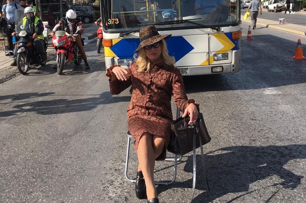 Κι όμως δεν πρόκειται για μια κομψή κυρία αλλά για γνωστό κύριο της σόουμπιζ. Μεταμφιέστηκε σε σικάτη γυναίκα και πόζαρε στη μέση του δρόμου μαζί με τα σκυλιά του ο Λάκης Γαβαλάς.