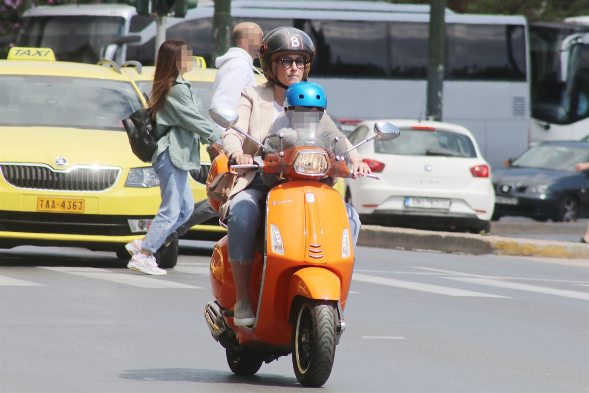 Πέρα από γυναίκα καριέρας είναι μαμά και προσπαθεί να τα προγραμματίζει όλα μέσα στην ημέρα ώστε να τα προλαβαίνει. Ο φωτογραφικός μας φακός την απαθανάτισε στο κέντρο της Αθήνας να οδηγεί τη βέσπα της έχοντας πάνω και το γιο της, Δήμο.