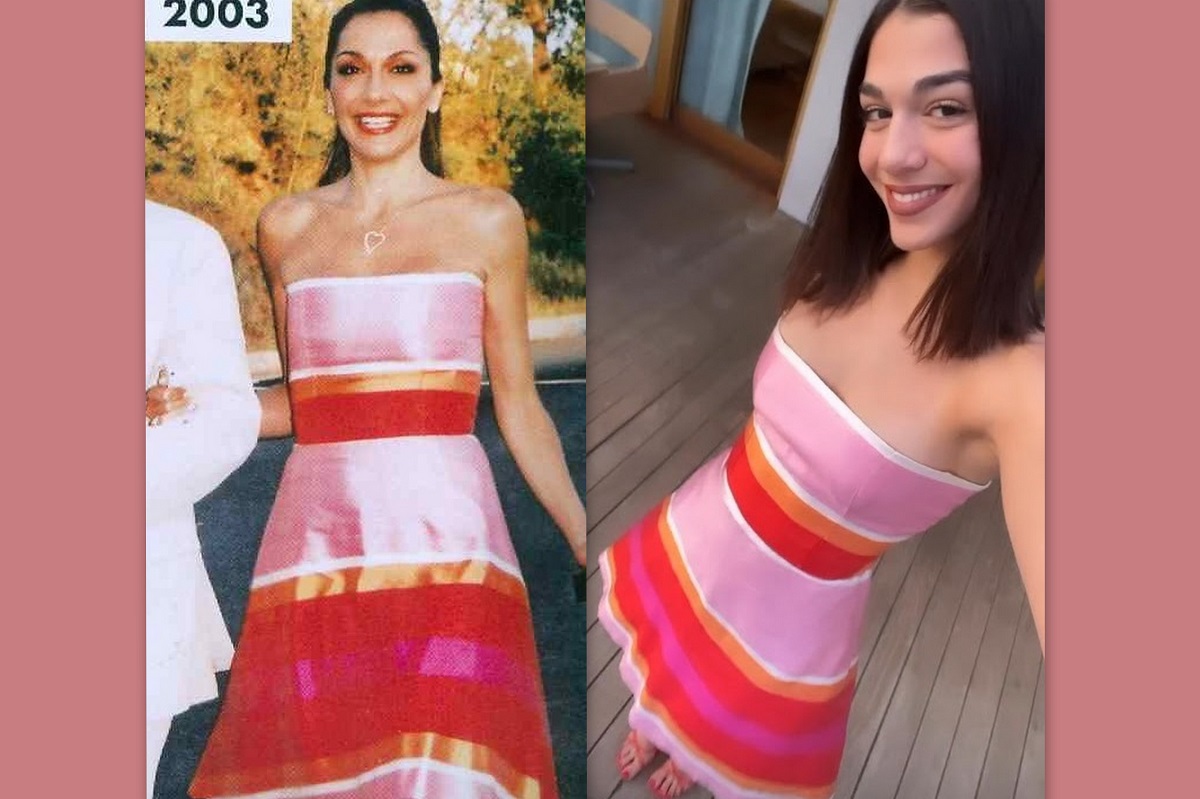 Μάλιστα συχνά δοκιμάζει φορέματα της τραγουδίστριας από το παρελθόν και βγαίνει με αυτά. Η όμορφη Μελίνα πρόσφατα πήγε καλεσμένη σε γάμο και επέλεξε να φορέσει ένα φόρεμα στράπλες που φόρεσε η μαμά της το 2003, δηλαδή ακριβώς πριν από 20 χρόνια και της ταίριαζε πολύ.