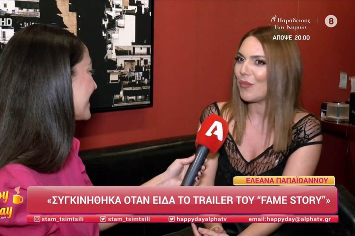 Η γνωστή τραγουδίστρια, μεταξύ άλλων, μίλησε για την συγκίνηση που ένιωσε όταν πρωτοείδε το trailer του μουσικού ριάλιτι αλλά και στην κόρη της. «Συγκινήθηκα όταν είδα τη διαφήμιση και άκουσα το τραγούδι του Fame Story. Βέβαια και μας βοήθησε το παιχνίδι, όλη εκείνη τη φουρνιά» ανέφερε αρχικά η Ελεάνα Παπαΐωάννου.