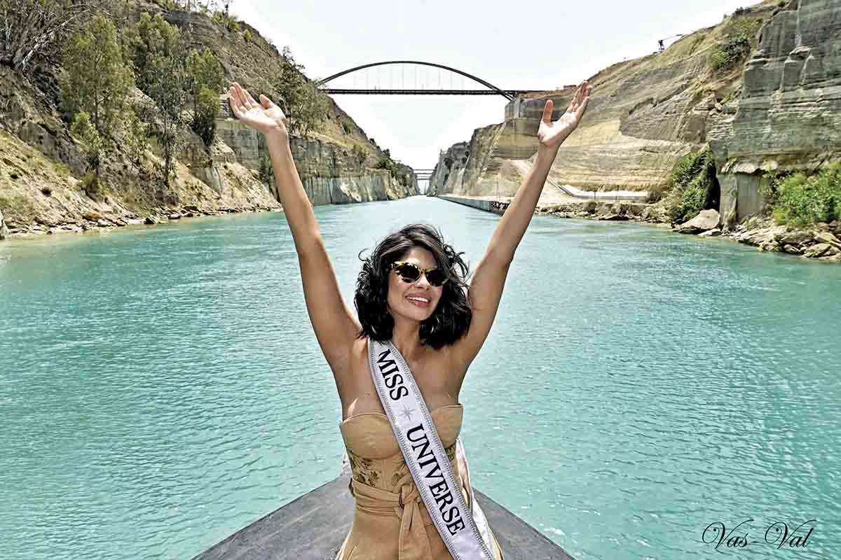 Ετσι, η 23χρονη καλλονή, ο δήμαρχος και το συνεργείο της πήραν καραβάκι και βόλταραν στα νερά του καναλιού της Κορίνθου. Μπορεί να μην ήταν τουρ στα κανάλια της Βενετίας, αλλά ήταν, όπως ευδιάκριτα δείχνουν οι φωτογραφίες, μια χαρούμενη στιγμή για τη Σέινις και «τον οικοδεσπότη δήμαρχο». Στο σημείο που διάλεξε για φωτογράφιση σταμάτησαν και η εκρηκτική μελαχρινή νεαρή φόρεσε την κορδέλα με τον τίτλο που είχε κατακτήσει στα καλλιστεία, μπήκε στη θάλασσα και κολύμπησε με το στράπλες φόρεμά της για τις ανάγκες της φωτογράφισης. Με τις πόζες της πήραν… φωτιά τα νερά της Κορίνθου.