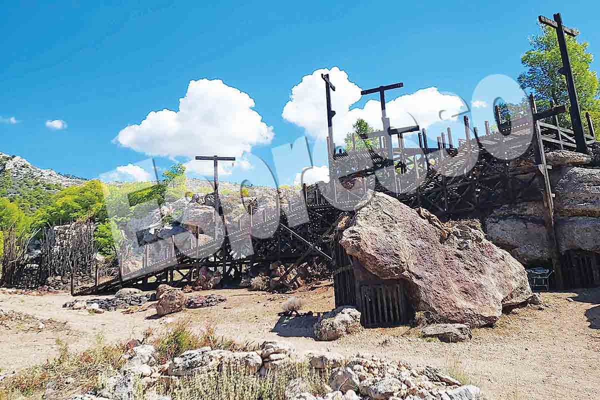 Τρεις ξύλινοι σταυροί τεράστιων διαστάσεων, σκουριασμένες σιδερένιες σκάλες και αλυσίδες, ματωμένα βράχια και σπηλιές είναι ίσως το πιο εντυπωσιακό σκηνικό από όσα είχαν στηθεί στο χολιγουντιανό πλατό των Μεγάρων. Το σημείο του μαρτυρίου, μάλιστα, όλο αυτό το διάστημα ήταν και το πιο αυστηρά φυλασσόμενο από όλα τα άλλα, καθώς η εταιρία παραγωγής θεωρεί ότι δημιούργησε ένα τοπίο που όμοιό του σε ταινία με θέμα τη ζωή του Χριστού δεν έχουμε ξαναδεί.