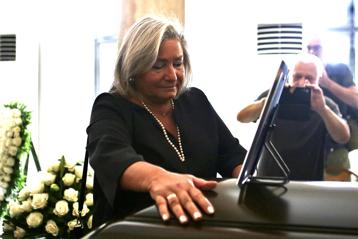 Σκιά του εαυτού της, η σύντροφος της ζωής του Λουκίλα Καρρέρ, η οποία περισσότερα από 30 χρόνια στάθηκε βράχος στο πλευρό του. «Ο πόνος είναι πόνος και γι’ αυτό πρέπει να τον πενθήσουμε έτσι όπως θέλουμε, με κλειστές κάμερες, μακριά από τα φώτα» είπε από μικροφώνου, ζητώντας απ’ όλους να αφήσουν την οικογένεια να τον αποχαιρετήσει όπως πρέπει. Εκεί δίπλα της, κρατώντας την από το χέρι, και η κόρη τους Ελενα, αλλά και ο γιος του Αντώνης (από τον πρώτο του γάμο), ο οποίος συγκινημένος προσπαθούσε να αποφύγει τις κάμερες και τους φωτογράφους, σχεδόν κρυμμένος πίσω από τα δυο του παιδιά, Τζέλλα και Στάθη, που συγκινημένοι άκουγαν τα τραγούδια από τα μεγάφωνα του κοιμητηρίου.