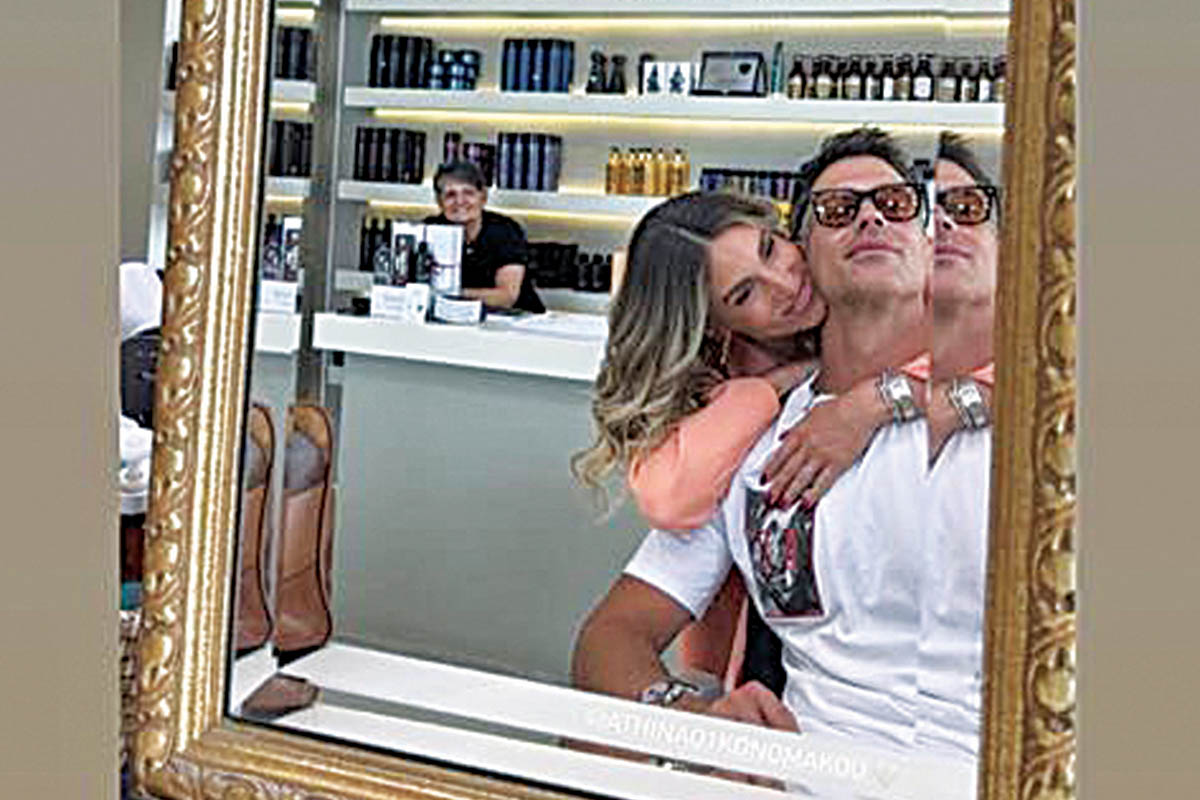 Πρώτα έκανε μια θεραπεία και ένα χτένισμα η όμορφη ηθοποιός και μετά ο πρώην μπασκετμπολίστας σύντροφός της κουρεύτηκε από τους καταξιωμένους hair dressers. Στον επιβλητικό χώρο, τον οποίο επισκέπτονται πολλές γνωστές προσωπικότητες από το καλλιτεχνικό και το πολιτικό πεδίο, βρέθηκε και ο ιδιοκτήτης της εταιρίας, γνωστός και ως «βασιλιάς της κερατίνης», Ιωάννης Αγγελόπουλος, ο οποίος διατηρεί φιλικές σχέσεις με το ζευγάρι.