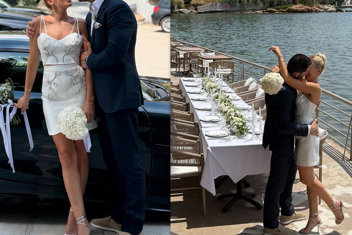Ο λόγος για την πρώην παίκτρια του «Survivor», Ρία Κολοβού και τον σύντροφό της, Γιώργο. Η Ρία Κολοβού δεν επέλεξε να βάλει νυφικό αλλά ένα λευκό κροπ τοπ με μια ψηλόμεση φούστα, ένα λευκό σετ με κεντημένες λεπτομέρειες και ο γαμπρός ένα κομψό μπλε κοστούμι.