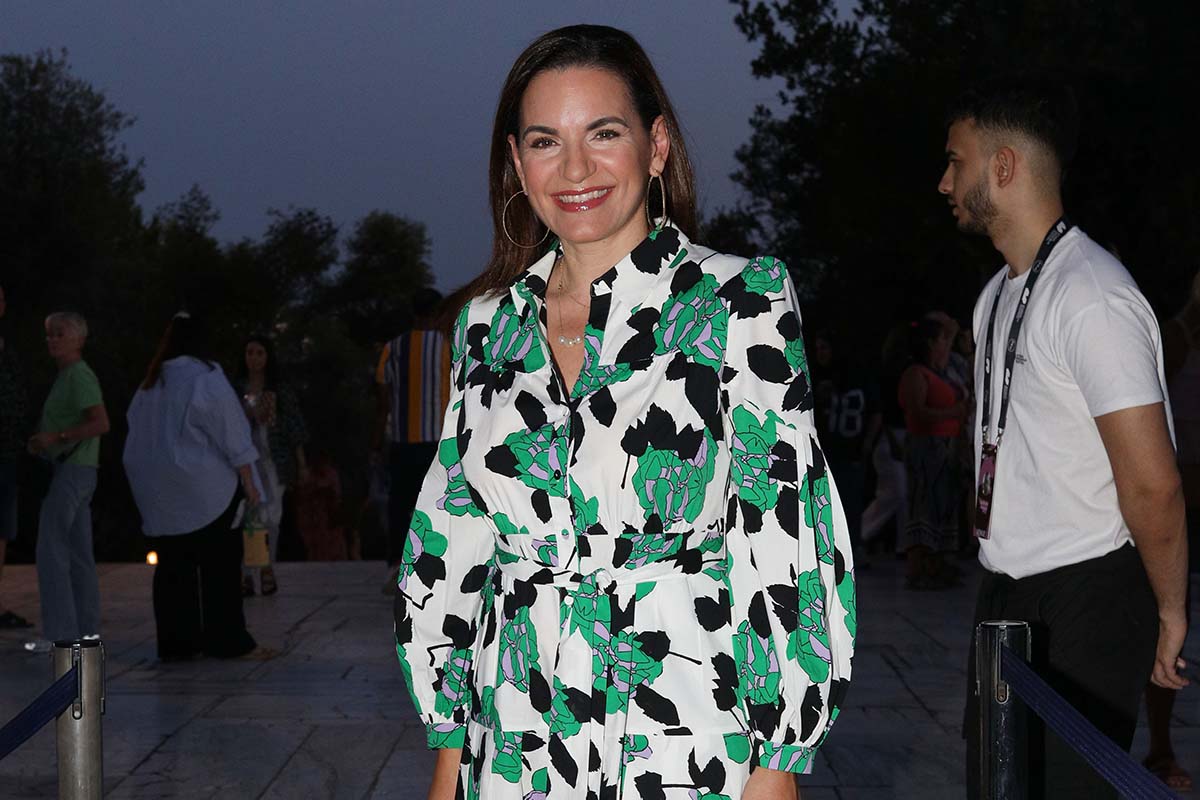 Φορώντας ένα εντυπωσιακό φόρεμα, σχεδόν και όχι απόλυτα φλοράλ, εμφανίστηκε στο Ηρώδειο προχθές το βράδυ η υπουργός Τουρισμού Ολγα Κεφαλογιάννη στη μία και μοναδική συναυλία των Raining Pleasure.