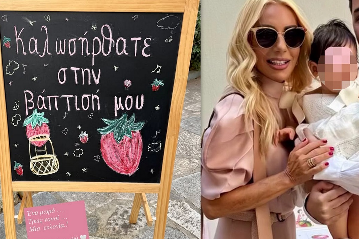 Ο ηθοποιός λόγω επαγγελματικών υποχρεώσεων δε θα μπόρεσε να παρευρεθεί αλλά επάξια τη θέση του πήρε ο γιος τους, Χάρης. «Ένα μωρό, τρεις νονοί, μια ευλογία», έγραψε η ηθοποιός.