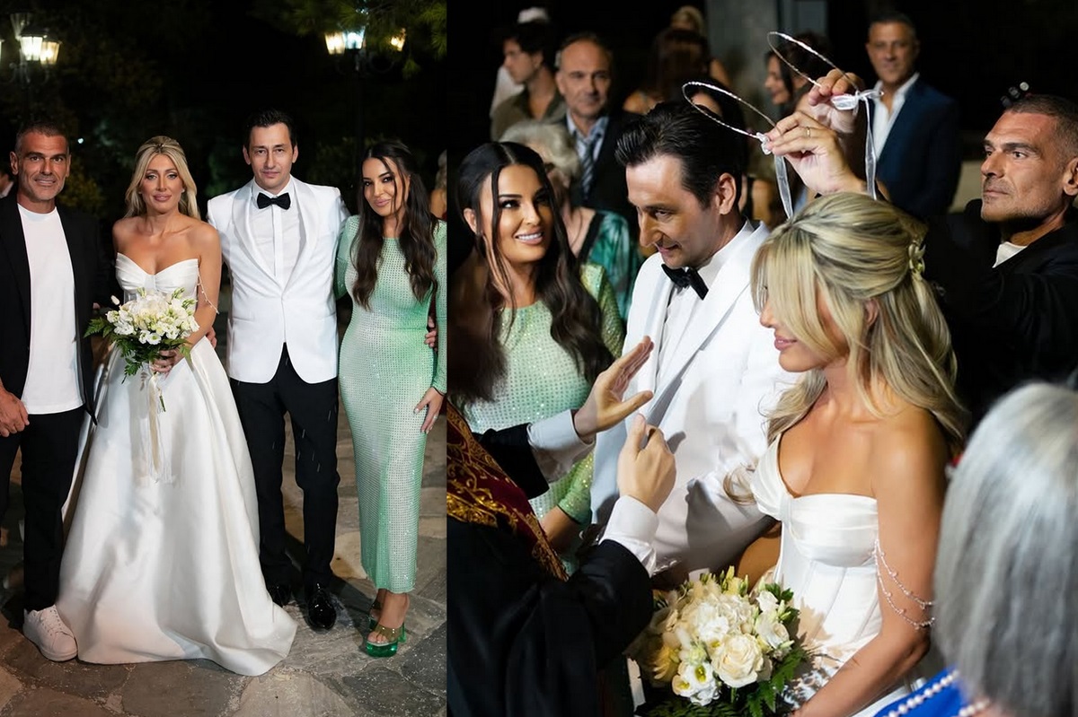 Ο γαμπρός επέλεξε απόχρωση του λευκού για το κοστούμι του. Κουμπάροι του ζευγαριού ήταν ο Τόνυ Μαυρίδης και η σύζυγός του, Εύα Καραμπατζάκη.