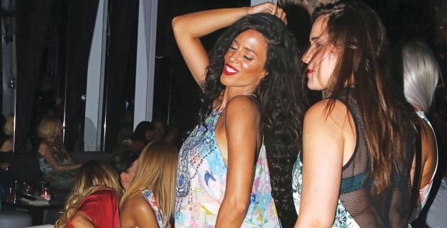 Χορεύει η καταμελάχρινη πια Κατερίνα Στικούδη, κουνιέται και λυγιέται με εμπριμέ φόρεμα και ψηλοτάκουνα πέδιλα, όμως η φίλη της δίπλα δεν παίρνει… γραμμή ότι της χαλάει το πλάνο! Στο βάθος, άλλα κορίτσια έχουν πιάσει το κους κους.
