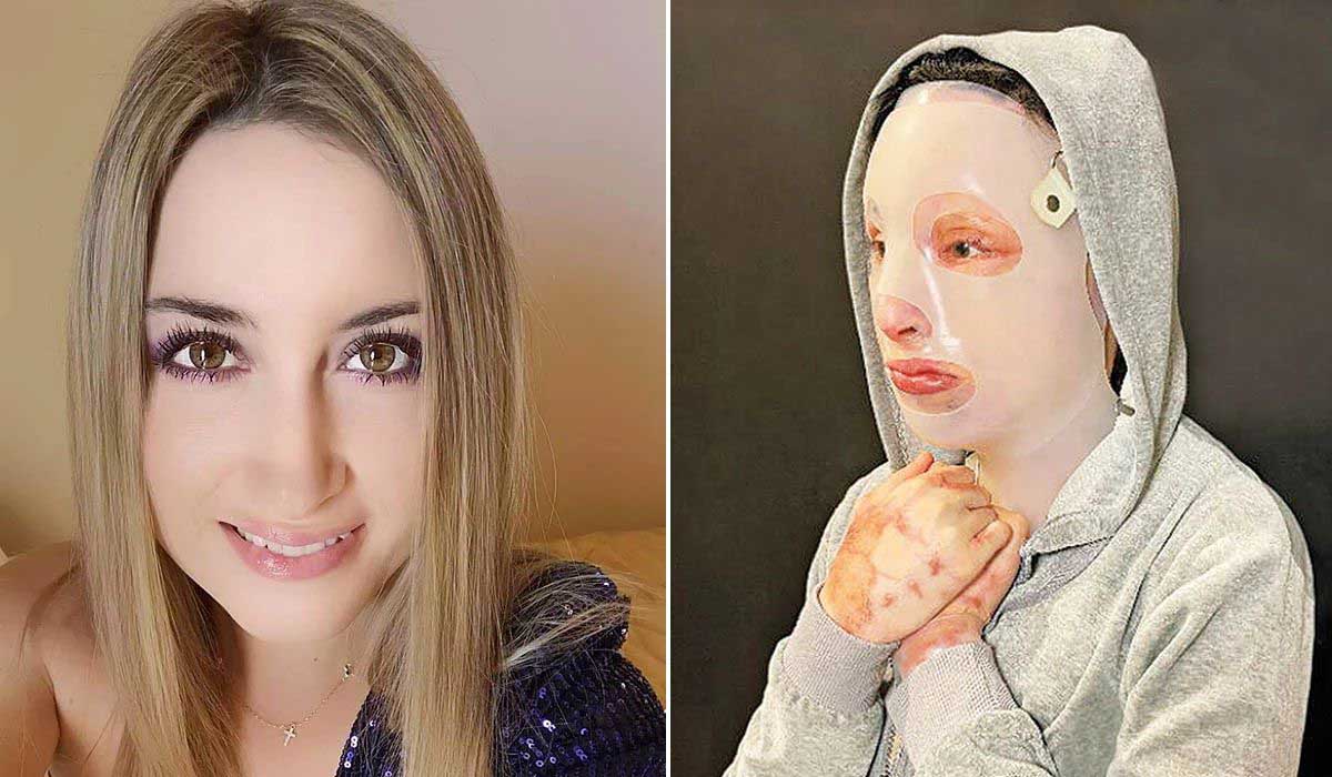 Συγκρίνοντας τις δύο φωτογραφίες του εξωφύλλου, διαπιστώνει κανείς ότι το πανέμορφο κορίτσι με τα μεγάλα εκφραστικά μάτια δεν υπάρχει πια… Εχει δώσει τη θέση του σε ένα δυστυχισμένο πλάσμα, το οποίο προσπαθεί να καλύψει τα σημάδια της κακοποίησης που τού άφησε η αρρωστημένη ζήλια ενός διεστραμμένου μυαλού! Επειτα από 10 χειρουργεία, η κοπέλα που είδε τη ζωή της να γκρεμίζεται από τη μια στιγμή στην άλλη είναι πλέον αναγκασμένη να φορά μια σκληρή πλαστική μάσκα, η οποία «κρατάει» το πρόσωπό της και βοηθά να σταθεροποιηθούν οι ιστοί. Παρ’ όλα αυτά, είναι εμφανή τα εγκαύματα στο πρόσωπό της, όπως και στα χέρια της!