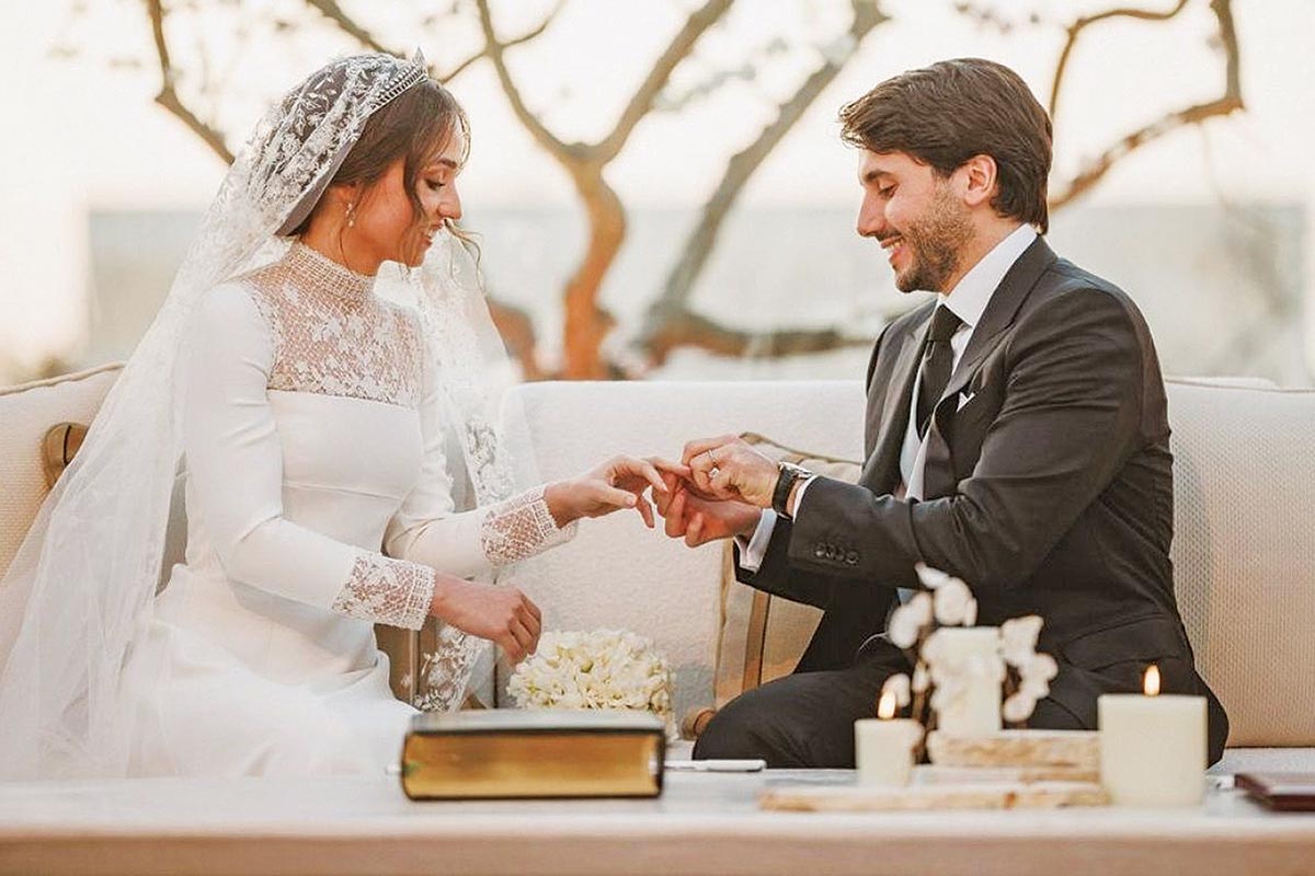 Ο χώρος ήταν διακοσμημένος στα λευκά και οι μελλόνυμφοι, αφού ο γαμπρός ασπάστηκε τον πεθερό βασιλιά, πήραν θέση για τη γαμήλια τελετή, έχοντας δίπλα τους τον βασιλιά Αμπντάλα Β’, τον ιμάμη, τη βασίλισσα Ράνια και τα αδέλφια της νύφης, την 23χρονη πριγκίπισσα Σάλμα και τον 18χρονο πρίγκιπα Χασέμ. Βέβαια, είχε προηγηθεί η είσοδος της νύφης με το δαντελωτό πέπλο και τη διαμαντένια τιάρα της μητέρας της στα μαλλιά, συνοδευόμενη από τον διάδοχο του θρόνου και αδελφό της πρίγκιπα Χουσεΐν, ο οποίος φορούσε την παραδοσιακή μαντίλα keffiyeh σε κόκκινο χρώμα, σύμβολο των αγώνων της Ιορδανίας.