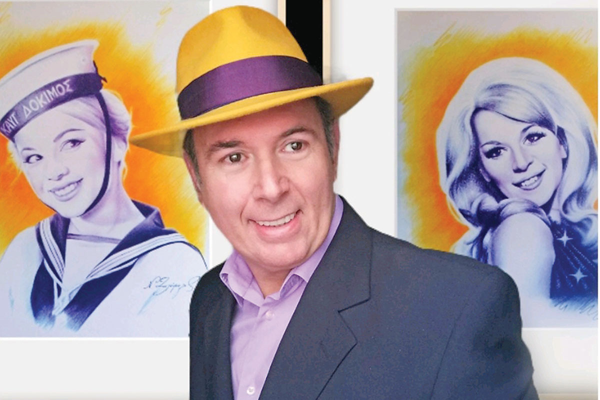 Ο Νίκος Ζαχόπουλος μπροστά από προσωπογραφίες της Αλίκης Βουγιουκλάκη