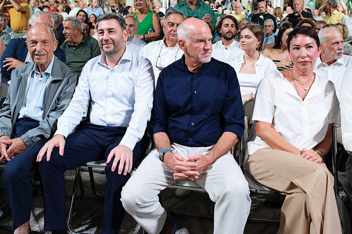 Στα χνάρια του πατέρα του και ιδρυτή του κόμματος, ο υιός και πρώην πρωθυπουργός Γιώργος Παπανδρέου, «full in love», απηύθυνε τον χαιρετισμό του έχοντας στις πρώτες σειρές των καθισμάτων καρφωμένο το λάγνο βλέμμα της συντρόφου του Γουέντι Κόνελι πάνω του. Τολμηρός όπως και ο πατέρας του Ανδρέας Παπανδρέου, εμφανίστηκε στην εκδήλωση με τη σύντροφό του, αδιαφορώντας για τα σχόλια των παρευρισκομένων, που δεν ήταν και λίγα…