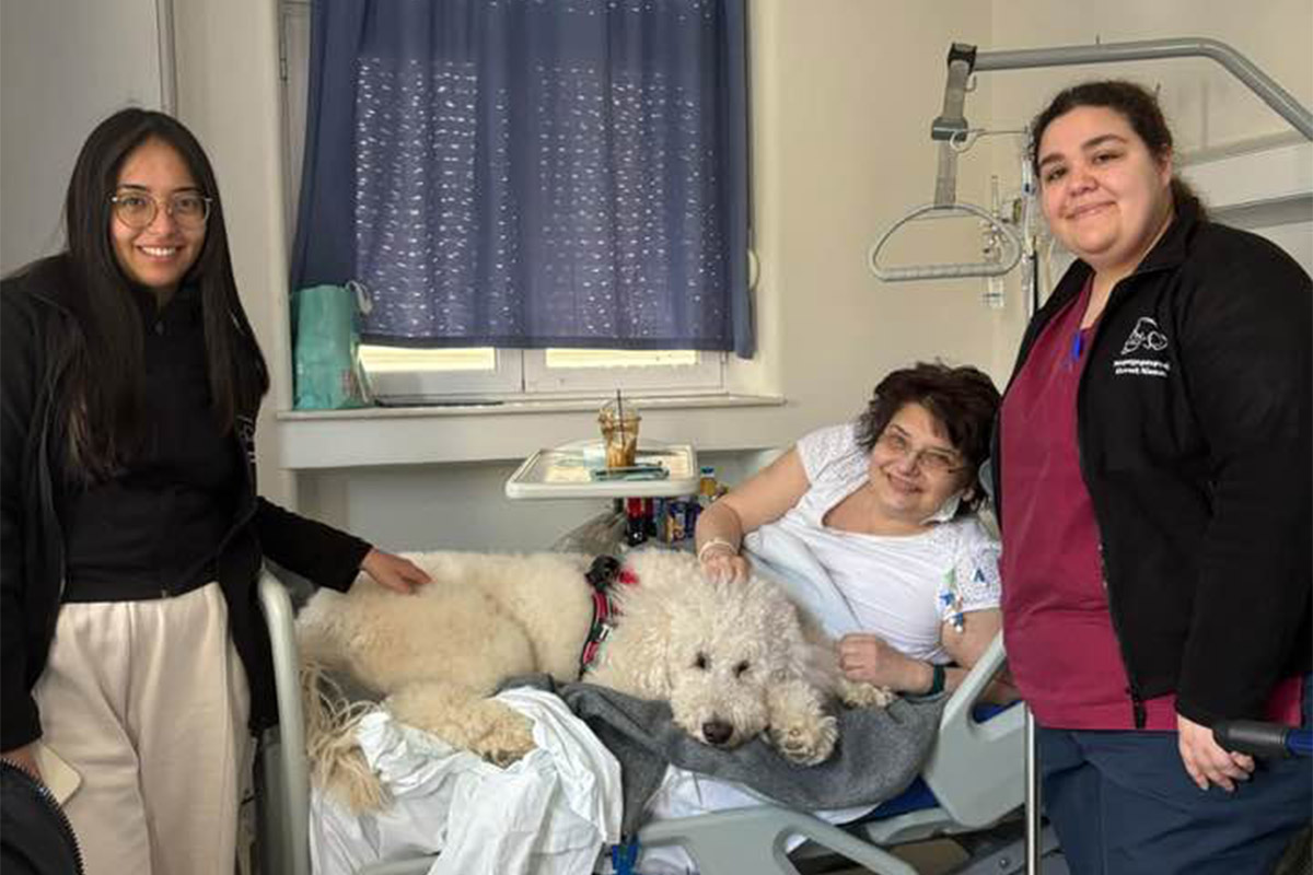 Ο αγαπησιάρης μεγαλόσωμος σκύλος, ράτσας Labradoodle, που μόλις έρθει σε επαφή με ασθενείς τούς μεταδίδει απίστευτη ηρεμία, πρόσφερε αγκαλιές και χάδια στην ασθενή του νοσοκομείου Εύη Ορφανού, η οποία χαρακτήρισε την επίσκεψη του γλυκύτατου τετράποδου στο δωμάτιό της ένα μικρό θαύμα. Σύμφωνα με την ίδια, ο σκύλος θεραπείας του οργανισμού Dogtherapy, ο οποίος έχει εκπαιδευτεί στην Ελλάδα και στην Αμερική από τους καλύτερους εκπαιδευτές και σε πιστοποιημένα προγράμματα, ώστε να παρέχει ένα σπουδαίο έργο, τη βοήθησε να αντιμετωπίσει πιο ανάλαφρα μια βαριά καθημερινότητα, που για εκείνη έχει γίνει το τελευταίο διάστημα μια μονότονη ακολουθία δύσκολων στιγμών.