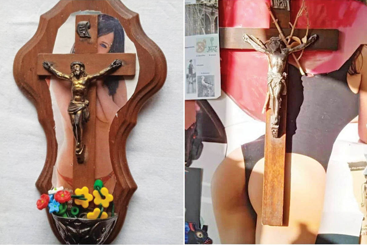 Ενα εξ αυτών, το οποίο προσβάλλει κατάφωρα την ορθόδοξη πίστη, απεικονίζει μια γυμνόστηθη γυναίκα. Ενδεχομένως, σε μια άλλη περίπτωση ένα έργο τέχνης σαν αυτό να μην προκαλούσε μεγάλες διαφωνίες. Ωστόσο, η συγκεκριμένη «δημιουργία» του 54χρονου Ελληνα καλλιτέχνη, ο οποίος βρέθηκε στο επίκεντρο σφοδρών επικρίσεων, αποκτά άλλη σημασία από τη στιγμή που έχει «τοποθετήσει» σε περίοπτη θέση της τον… Εσταυρωμένο, σε μια εξόφθαλμη προσπάθεια να προκαλέσει! Σε άλλο έργο τέχνης ο Χριστόφορος Κατσαδιώτης έχει βάλει τον Εσταυρωμένο στο μέσο ενός… τσιπ μνήμης υπολογιστή, ενώ σε ένα τρίτο έχει χρησιμοποιήσει μια αγιογραφία των Αρχαγγέλων Μιχαήλ και Γαβριήλ, τοποθετώντας στη μέση της μια αναπαράσταση ζώου που μοιάζει με σκύλο ή λιοντάρι.