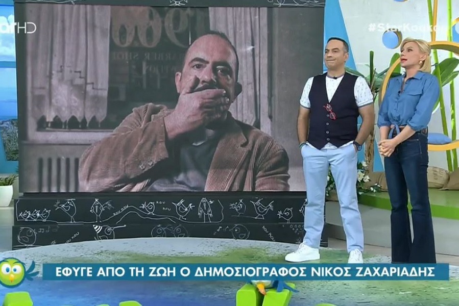 «Αυτό που θα σας πούμε τώρα έπρεπε να το είχαμε κάνει στην αρχή της εκπομπής. Όμως, επειδή είναι κάτι το οποίο είναι πολύ ιδιαίτερο και πολύ, για εμάς τους δυο, σημαντικό, θέλαμε να το κρατήσουμε για το κλείσιμο γιατί ξέρουμε πολύ καλά απ’ ότι κι αν μας βλέπει ο Νίκος αυτή τη στιγμή πως το μόνο πράγμα που θα ήθελε ήταν να γελάμε, όπως μας έκανε να γελάμε πάντα ο Νίκος Ζαχαριάδης.