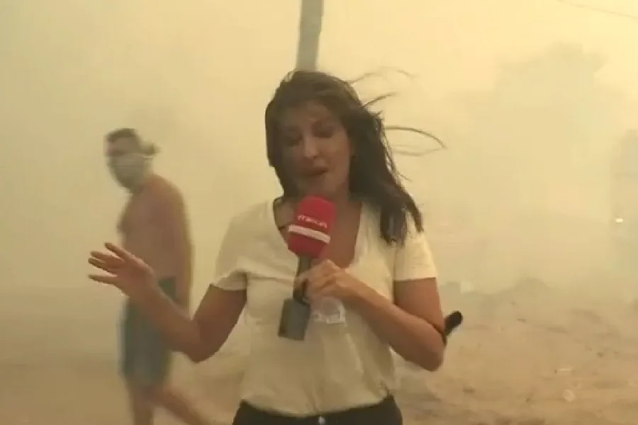 Σε κατάσταση σοκ η ρεπόρτερ της εκπομπής Βελίκα Καραβάλτσιου κατά τη διάρκεια της μετάδοσης του ρεπορτάζ για τη φωτιά.