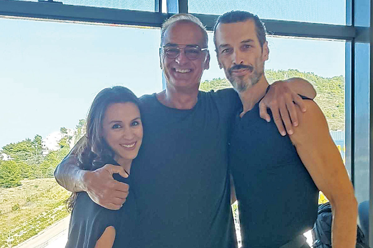 O Μάριος και η Σοφία με τον τετράποδο ήρωα της σειράς «Μαύροι πίνακες», τον Δούκα, και τον εκπαιδευτή του Σπύρο Βαϊτσόπουλο