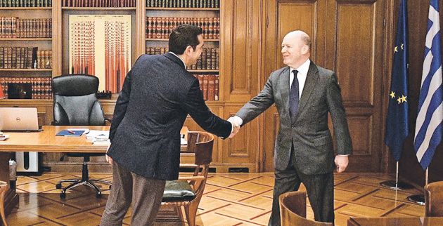 Καπιταλισμός στο φουλ. Τώρα και στο Μέγαρο Μαξίμου, με τον αριστερό πρωθυπουργό Αλέξη Τσίπρα να υποδέχεται θερμά τον Τζον Κράιαν, διευθύνοντα σύμβουλο της Deutsche Bank, στο Μέγαρο Μαξίμου.