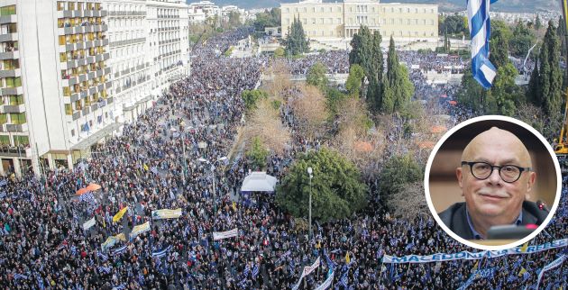 Λέει λοιπόν ο Δουζίνας: «Πρέπει να διαχωρίσουμε το πλήθος των Αγανακτισμένων από αυτό του συλλαλητηρίου. Χαρακτηριστικό των Αγανακτισμένων ήταν η ομιλία, ενώ του συλλαλητηρίου η αφωνία. Κάποιος μιλάει, το πλήθος ακούει. Η ομιλία καταδικάζει τους συγκεντρωμένους σε φίμωση, αφού πρέπει να χειροκροτούν, να κραυγάζουν, να επιδοκιμάζουν τον ομιλητή και να αποδοκιμάζουν τους αντιπάλους. Η βουβαμάρα του πλήθους, η παρουσίασή του στις τηλεοράσεις ως ενωμένου, μαζικού, επευφημούντος αλλά μη σκεπτόμενου είναι ο λόγος ύπαρξής του. Οι
