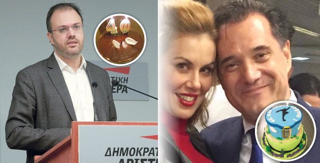 Ο Αδωνις Γεωργιάδης, παρουσία της Ευγενίας Μανωλίδου και κολλητών του, έσβησε μια τούρτα-υπερπαραγωγή εν μέσω… πυροτεχνημάτων, ευχών και μουσικής. Αντιθέτως, ο πρόεδρος της ΔΗΜ.ΑΡ. Θανάσης Θεοχαρόπουλος, με μια λιτή τούρτα σοκολάτα που πάνω είχε κεράκια τα οποία έγραφαν «40» και δίπλα στο νεογέννητο μωρό του, χάρηκε τη βραδιά των γενεθλίων του στο σπίτι.