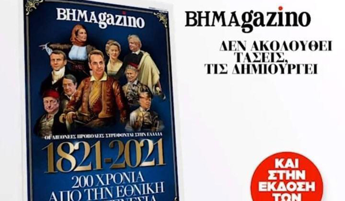 Το φιτίλι άναψε όταν κυκλοφόρησε το διαφημιστικό βίντεο για το περιοδικό (της εφημερίδας «Το Βήμα») «ΒΗΜΑgazino» αυτής της Κυριακής. Οσοι το είδαν αρχικά δεν πίστευαν στα μάτια τους, καθώς στο εξώφυλλο δεν απεικονίζονταν οι ήρωες της Επανάστασης, αλλά -με ρούχα του 1821- ο Κ. Μητσοτάκης, η Γ. Αγγελοπούλου και -σε σχετικά δεύτερο πλάνο- ξένοι ηγέτες…