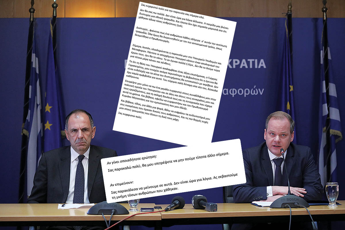 Ωστόσο, ο Κώστας Α. Καραμανλής δεν παρέλειψε και χθες να τραβήξει τα φώτα της δημοσιότητας πάνω του, καθώς εμφανίστηκε στην τελετή παράδοσης-παραλαβής του υπουργείου Υποδομών και Μεταφορών με έτοιμες απαντήσεις, σε περίπτωση που οι δημοσιογράφοι ήθελαν να καταθέσουν ερωτήσεις για το τραγικό δυστύχημα στα Τέμπη. Το «σκονάκι» του Καραμανλή αποκαλύφθηκε από την απροσεξία των συνεργατών του, καθώς στη δήλωση που διένειμαν από το γραφείο του προς τους δημοσιογράφους ξέχασαν να βγάλουν το «σκονάκι» από το έγγραφο, με αποτέλεσμα να δει το φως της δημοσιότητας.