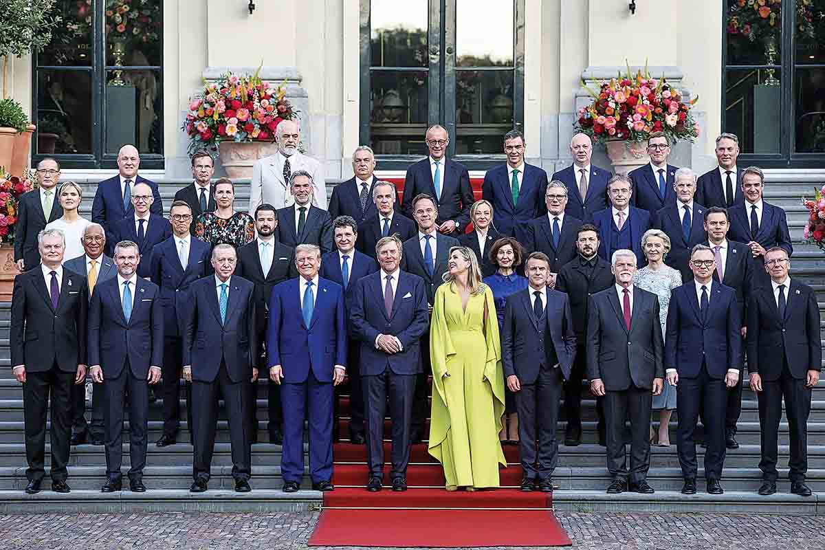 «Παρκαρισμένος» πάνω δεξιά, στην προτελευταία σειρά, ήταν ο πρωθυπουργός της Ελλάδας Κυριάκος Μητσοτάκης στην επίσημη οικογενειακή φωτογραφία που έβγαλαν οι ηγέτες του ΝΑΤΟ προτού δειπνήσουν με το βασιλικό ζεύγος της Ολλανδίας στην αίθουσα Oranjezaal. στο παλάτι Huis ten Bosch.