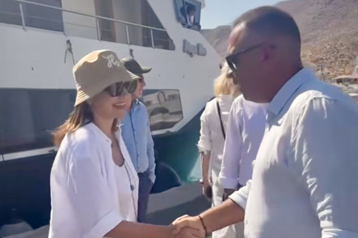 Η υπουργός Τουρισμού Όλγα Κεφαλογιάννη πήγε στη μαγική Φολέγανδρο, κι όταν την υποδέχτηκε ο δήμαρχος του νησιού Κυριάκος Μαρινάκης, φορούσε καπελάκι.