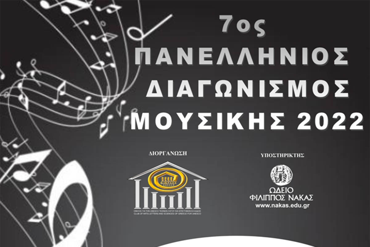 Ο Όμιλος για την UNESCO Τεχνών, Λόγου και Επιστημών Ελλάδος, υπηρετώντας τα ιδανικά του Πολιτισμού και θέλοντας να καταστεί αρωγός των νέων μουσικών ταλέντων της πατρίδας μας, προκηρύσσει τον 7ο Πανελλήνιο Διαγωνισμό Μουσικής, για το 2022. Ο διαγωνισμός πραγματοποιείται με την υποστήριξη του Ωδείου Φίλιππος Νάκας, Ιπποκράτους 41, 106 80, Αθήνα.
