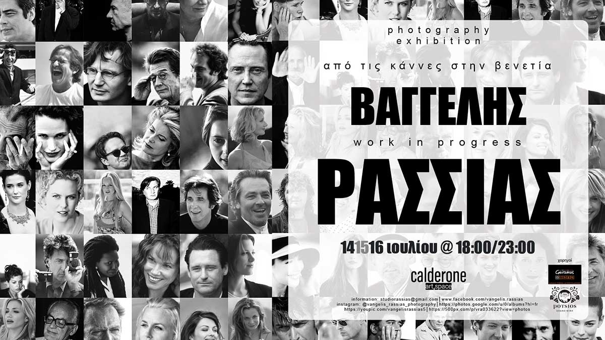 Η νέα ατομική έκθεση φωτογραφίας του Βαγγέλη Ρασσιά με τίτλο «Από τις Κάννες στη Βενετία», φιλοξενείται από τις 14 έως τις 16 Ιουλίου στο Calderone Art. Space στο Γκάζι και αποτελεί ένα οδοιπορικό στιγμών και βλέμματος στον αστραφτερό κόσμο του διεθνούς κινηματογράφου.
