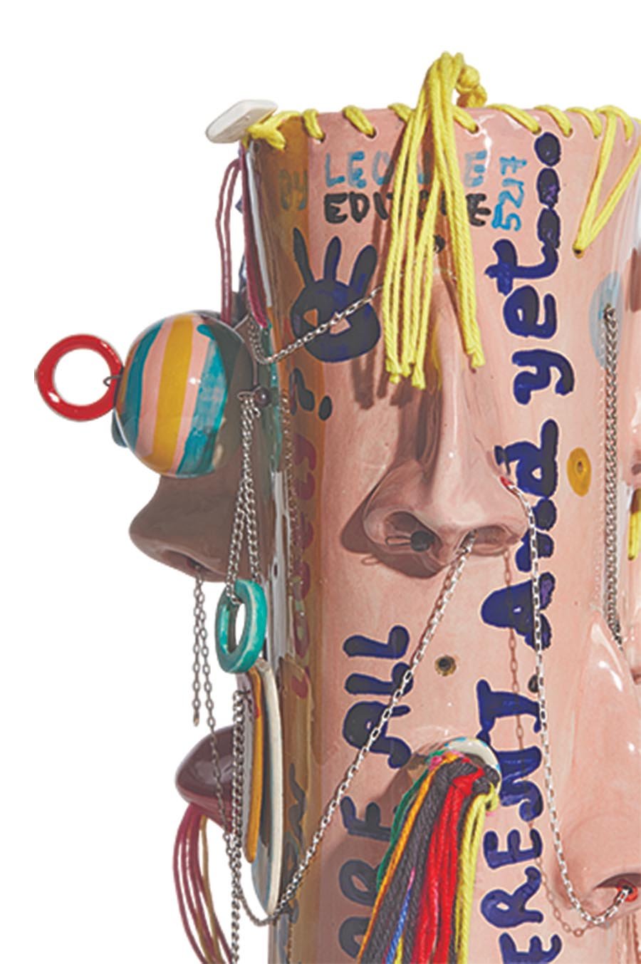 Στο έργο της η μύτη εμφανίζεται ως επαναλαμβανόμενο μοτίβο που προεξέχει από τις σελίδες του βιβλίου. Γύρω της, πρόσθετα στοιχεία -σύρματα, χάντρες, αλυσίδες, κλωστές- διαπερνούν την κεραμική επιφάνεια και δίνουν στο έργο μια σαρκαστική αλλά και τρυφερή διάσταση. Η Γιαγδζόγλου χειρίζεται τη μορφή σαν σχόλιο, σαν υπαινιγμό: «Η μύτη σαρκάζει τη διαφορετικότητα ως μια σχετική έννοια. Μια και που όλοι μας, τελικά, έχουμε από μία μύτη».