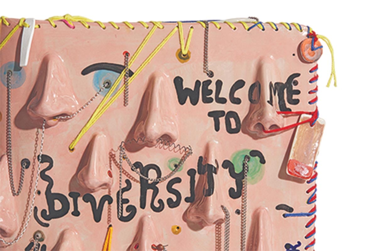 Το έργο της Λ. Γιαγδζόγλου, με τίτλο «Welcome to Diversity», είναι ένα από εκείνα τα βιβλία που δεν ξεφυλλίζονται. Δεν διαβάζονται. Αντίθετα, προσκαλούν τον θεατή να το αγγίξει, να το περιεργαστεί, να το αποκωδικοποιήσει. Πρόκειται για ένα βιβλίο-γλυπτό από πηλό, που συνδυάζει την υλικότητα της κεραμικής με τη σημειολογία του ανθρώπινου προσώπου.