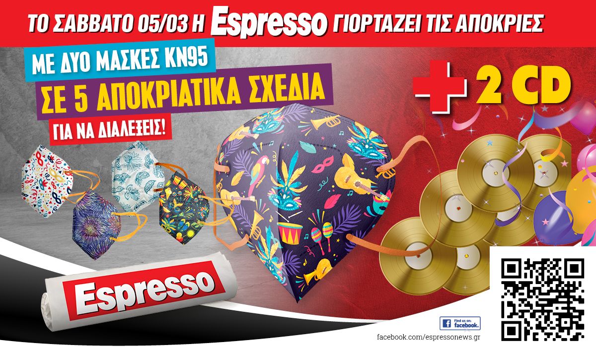 Το Σάββατο 05.03 η Espresso γιορτάζει τις Απόκριες με δύο μάσκες ΚΝ95 σε 5 αποκριάτικα σχέδια για να διαλέξεις!